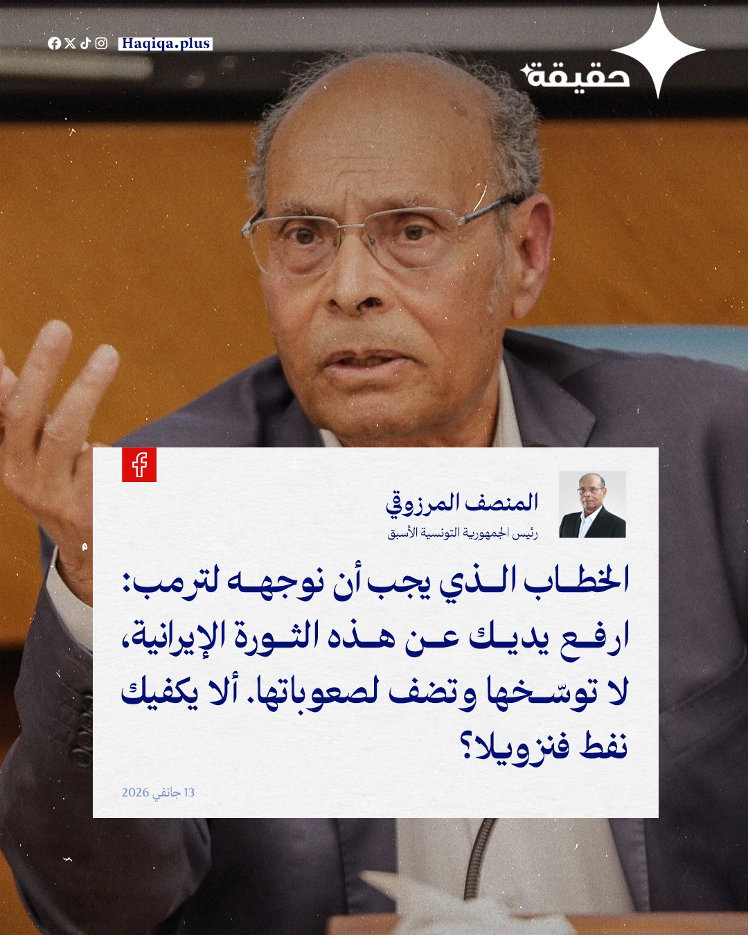 وفي هذا السياق، دعا المرزوقي الولايات المتحدة، وتحديدًا الرئيس الأميركي السابق دونالد ترمب، إلى عدم التدخّل في الحراك الإيراني أو استغلاله، محذرًا من تحويله إلى ورقة صراع دولي تُفرغه من طابعه الشعبي وتزيد من تعقيداته.