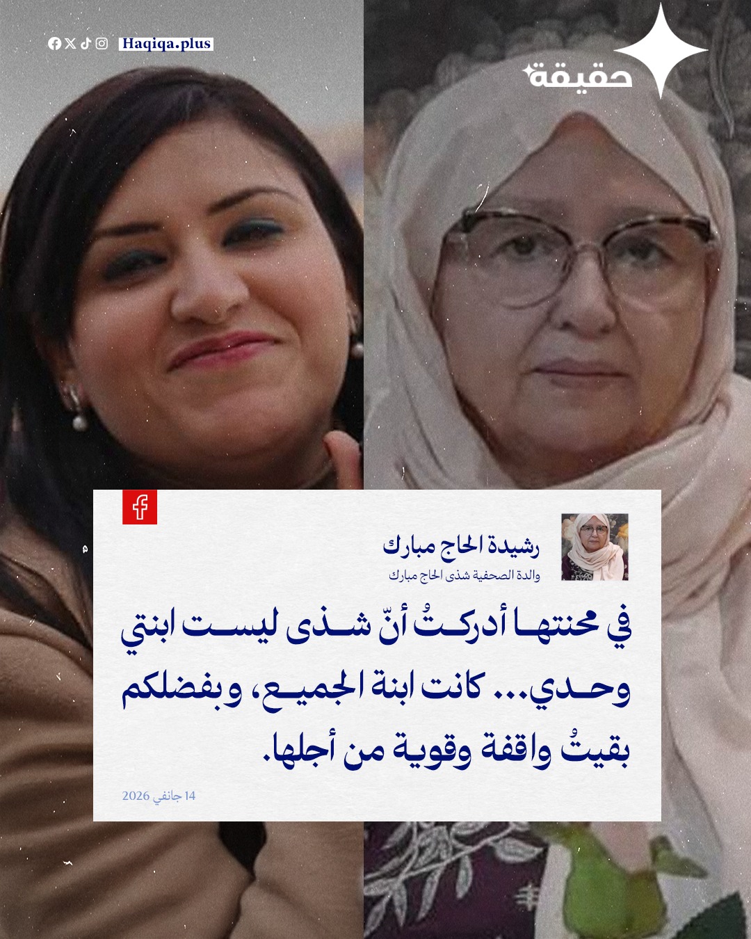 عبّرت رشيدة الحاج مبارك، والدة الصحفية شذى الحاج مبارك، في تدوينة لها عن امتنانها الواسع لكلّ من ساند ابنتها خلال فترة إيقافها، مؤكدة أنّ التضامن الذي حظيت به شذى جعلها تشعر بأنّ ابنتها لم تكن وحدها في محنتها، بل كانت محاطة بدعم إنساني ومعنوي واسع. وتأتي هذه الكلمات عقب الإفراج عن شذى، في سياق إنساني يعكس أثر التضامن المجتمعي في دعم عائلات الموقوفين ومساندتهم في الفترات الصعبة.